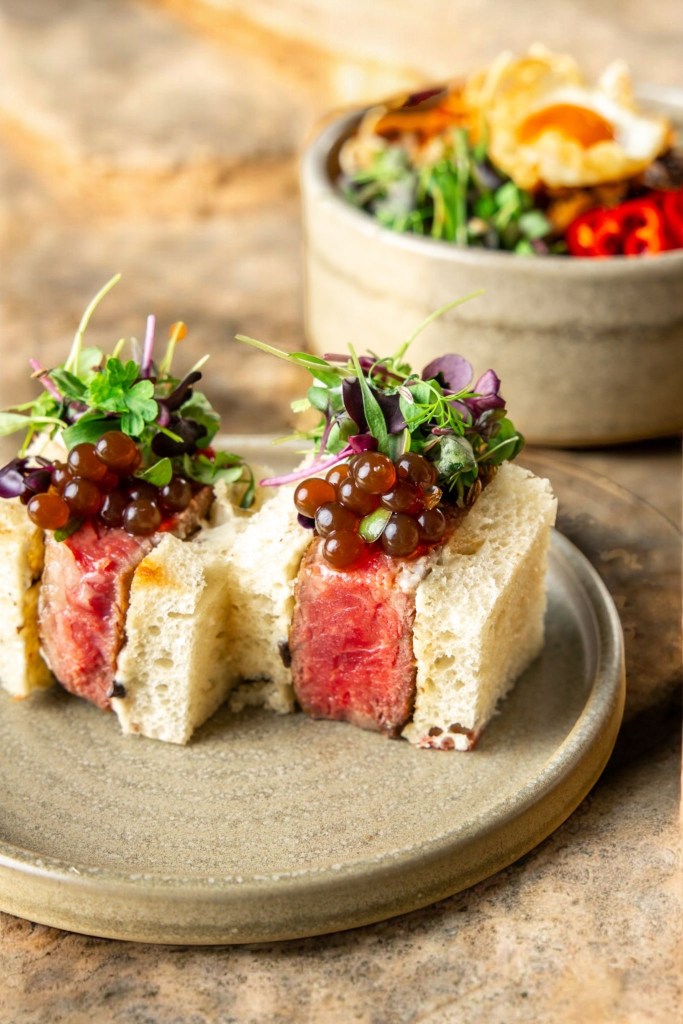 - Beef Rib-Eye Sando with truffle mayo and balsamic caviar