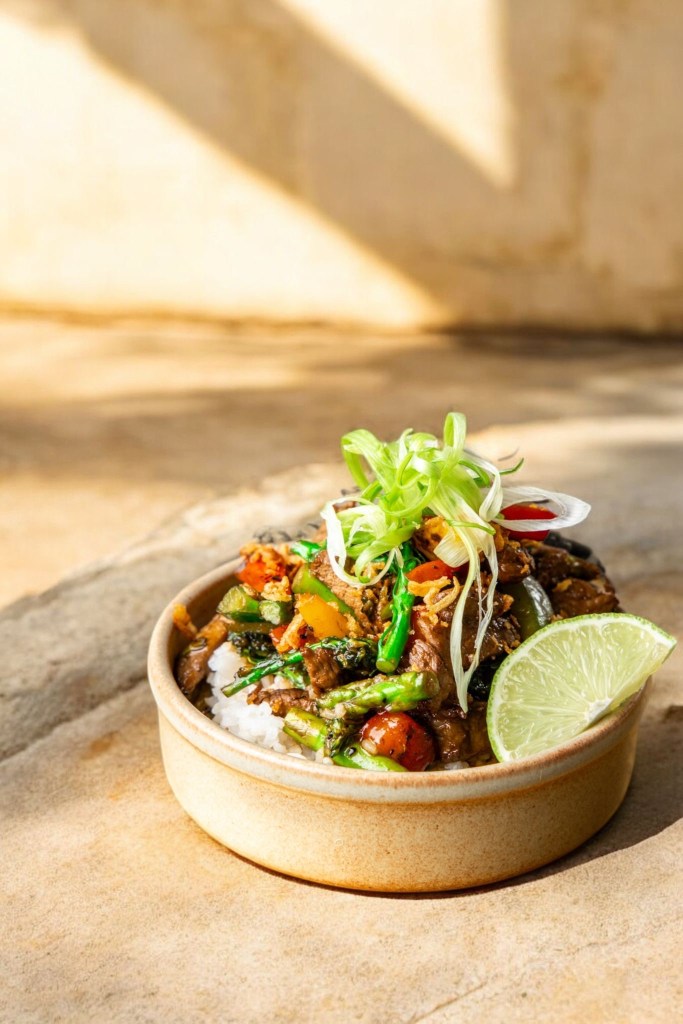 - Black Pepper Beef with jasmine rice and wok-fried vegetables